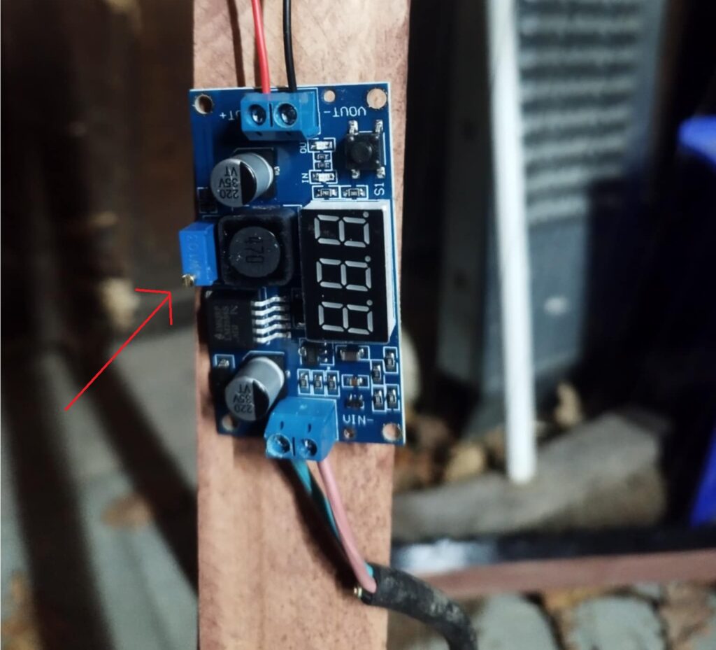 Gebruik 2 stevige koperdraden om naar je12V bron te gaan. Dit kan een zonnepaneeltje of een 12v batterij zijn. De 12v convertor springt onmiddellijk aan zodra deze stroom krijgt. Gebruik het Kleine vijsje om naar 3v te gaan.
