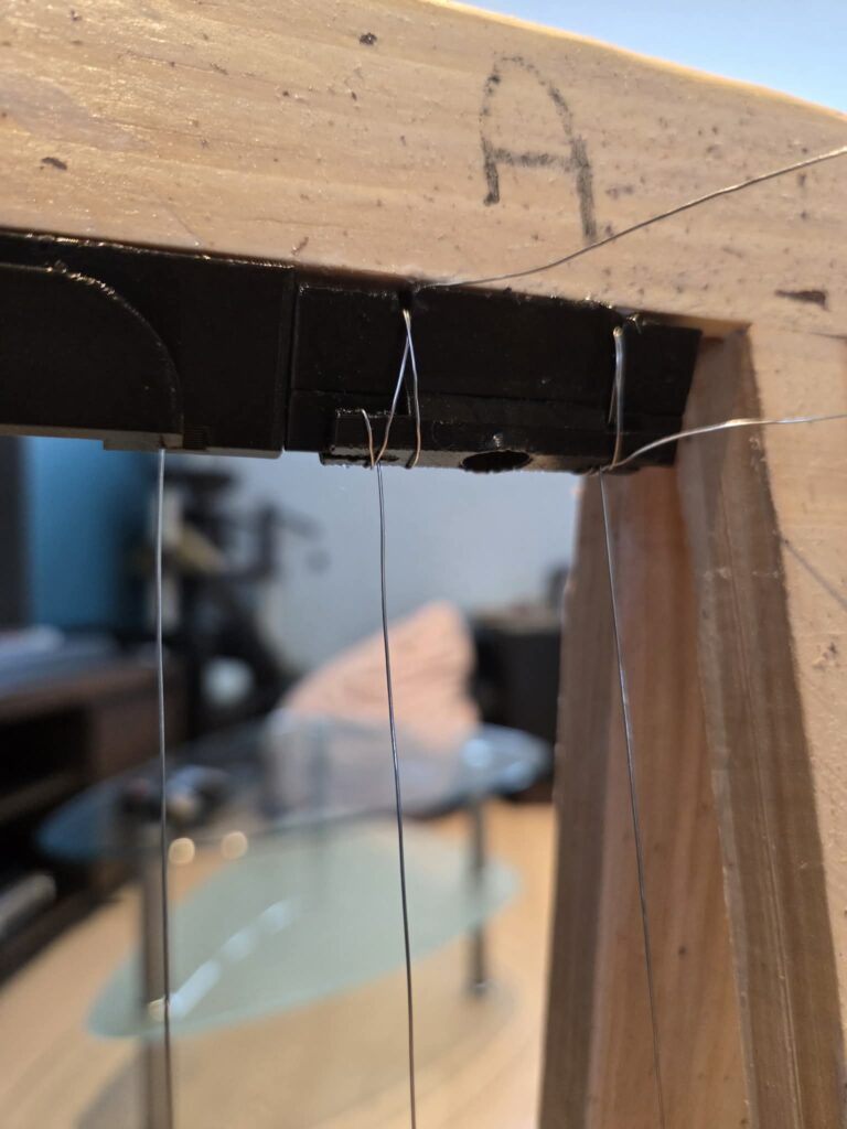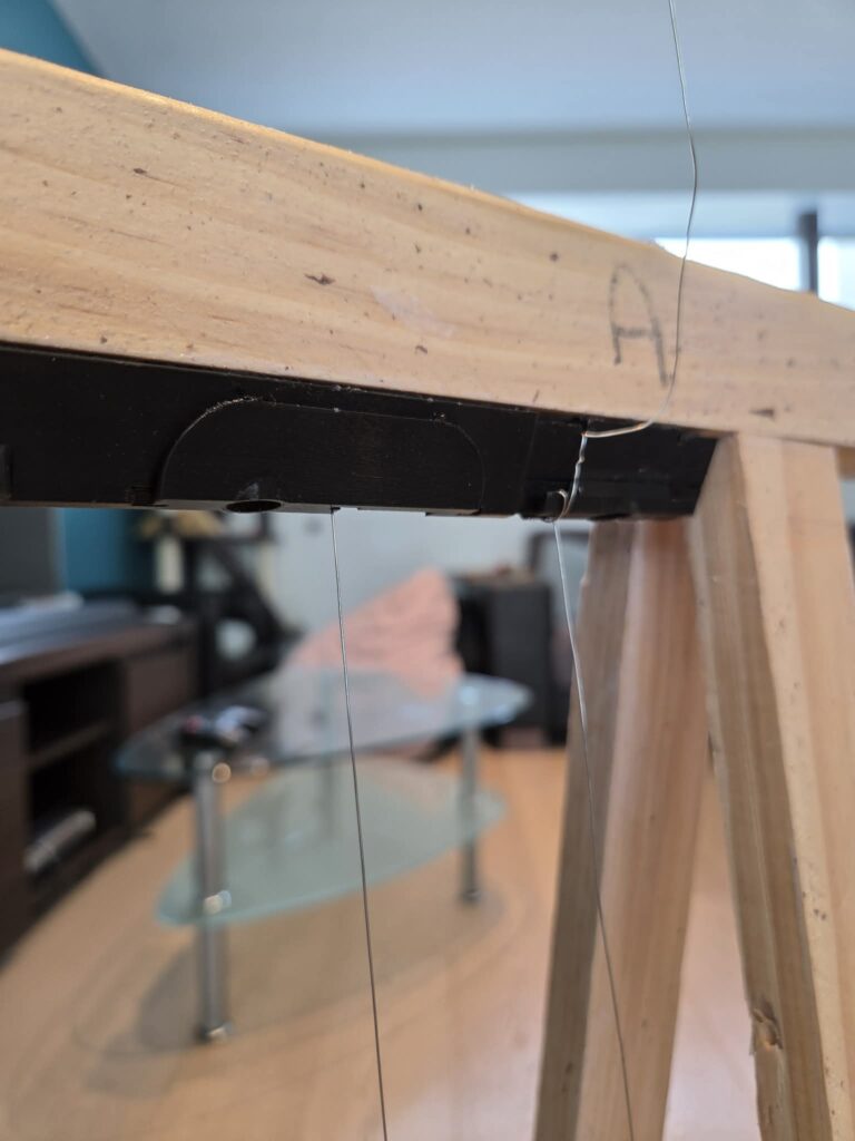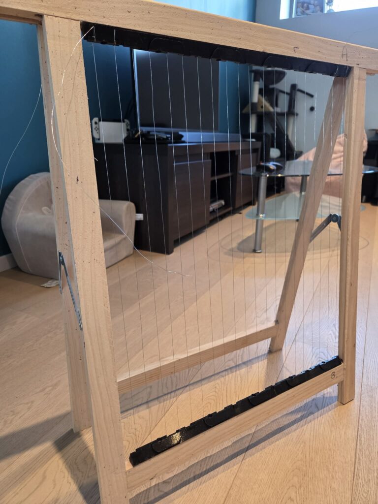 Starten doe je door de draad ONDER het startblokje door te halen en vast te draaien (een paar keer omwinden) aan het start-lipje. Opgelet, goed aantrekken, niet doortrekken… pastiek is sterk maar geen metaal (en in je vingers snijden kan evengoed!). Je kan best éérst de binnenkant van de schraag doen, anders kan je daar moeilijk bij (als je vooraan al draad hebt gespannen 😉 ).