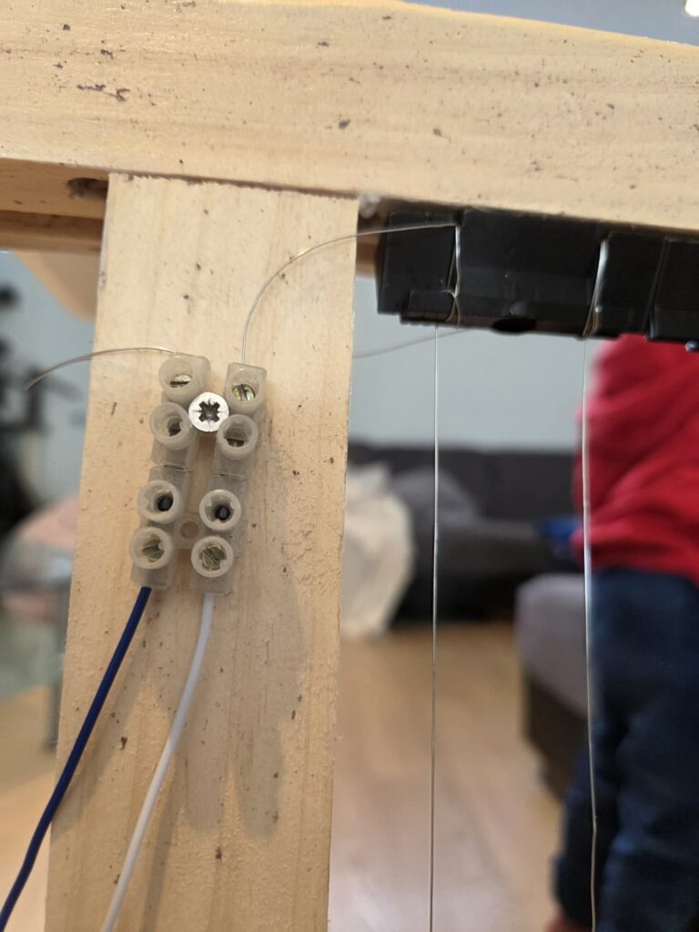 Hoe testen? Met een vast stroombron in het donker… gooi een nagel of schroef naar de harp en je ziet de vonkjes.