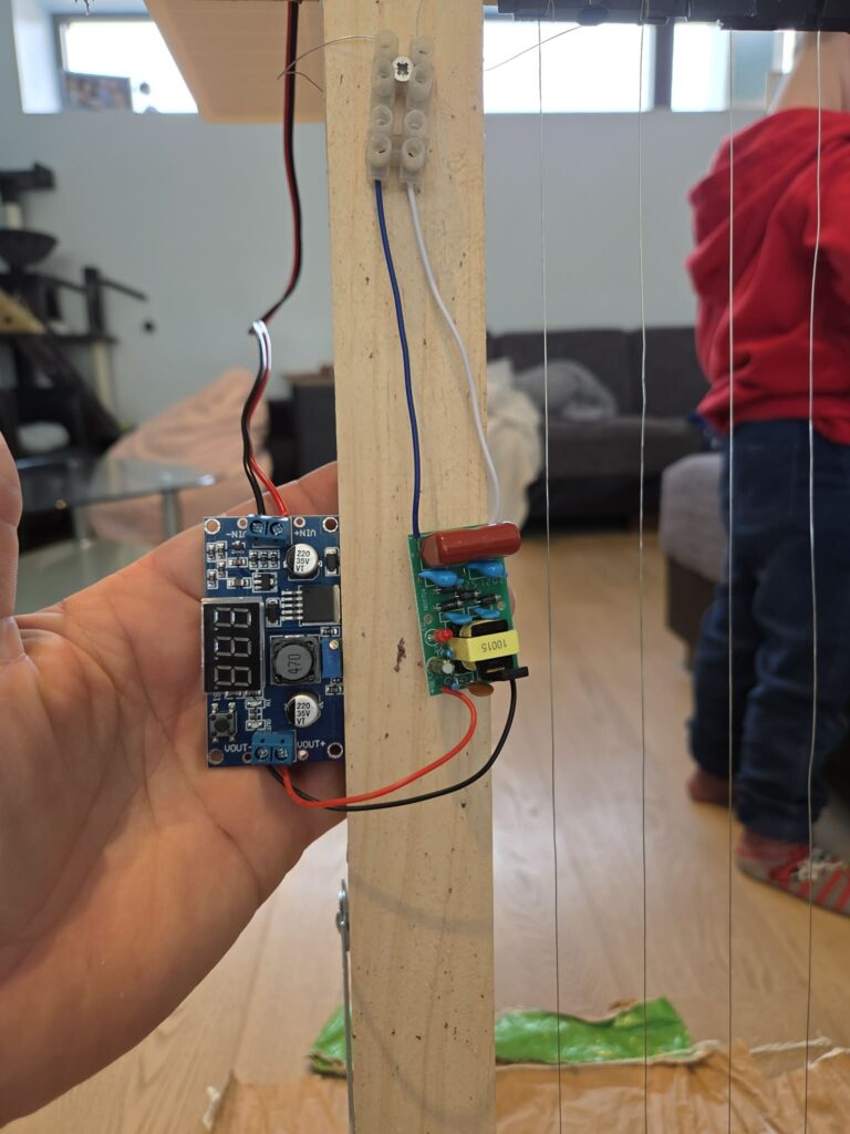 Als je 3v (tot max 4v) hebt bereikt kan je de voltage booster aansluiten. Je krijgt nu +-1800V op de draden met een laag Amperage. Niet-dodelijk dus 😊…althans voor de mens…